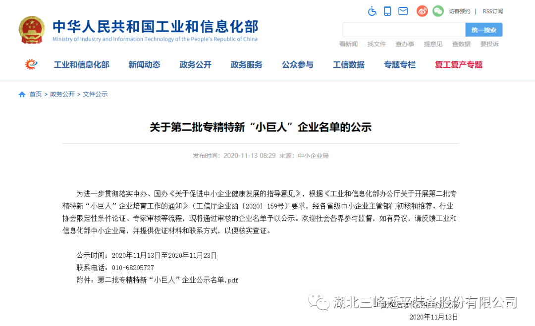 2020年7月,我公司根據(jù)《工業(yè)和信息化部辦公廳關(guān)于開展第二批專精特新“小巨人”企業(yè)培育工作的通知》(工信廳企業(yè)函〔2020〕159號)要求,申報了第二批專精特新“小巨人”企業(yè),經(jīng)過省級中小企業(yè)主管部門初核和推薦、行業(yè)協(xié)會限定性條件論證、專家審核、企業(yè)名單公示等流程,公司憑借顯著的創(chuàng)新、研發(fā)、生產(chǎn)能力獲得第二批專精特新“小巨人”企業(yè)稱號。